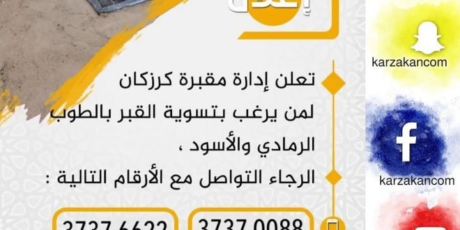 *تعلن* *إدارة مقبرة كرزكان* لمن يرغب بتسوية القبر بالطوب الرمادي والأسود *التواصل عبر مركز الاتصال* 37376622 37370088 #مقبرة_كرزكان #كرزكان #كرزكانكم #أخبار_كرزكانكم #منوعات_كرزكانكم #قريتنا #أخبار_القرية #قريتنا_الحبيبة #قرية_كرزكان #أخبار_قرية_كرزكان #قرى_البحرين #مملكة_البحرين #البحرين #بحريننا #bahrain #karzakan #karzakancom #karzakancom_news المصدر