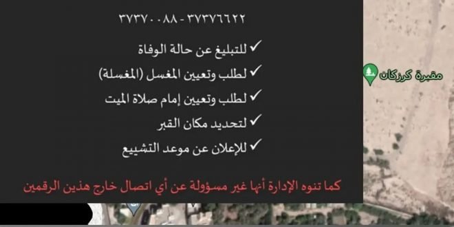 *تعلن* *إدارة مقبرة كرزكان* *عن إنشاء مركز اتصالات للمقبرة عبر الاتصال المباشر على الرقمين التاليين* 37376622 – 37370088 🔸 للتبليغ عن حالة الوفاة 🔸 لطلب وتعيين المغسل (المغسلة) 🔸 لطلب وتعيين إمام صلاة الميت 🔸 لتحديد مكان القبر 🔸 للإعلان عن موعد التشييع *كما تنوه الإدارة أنها غير مسؤولة عن …