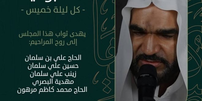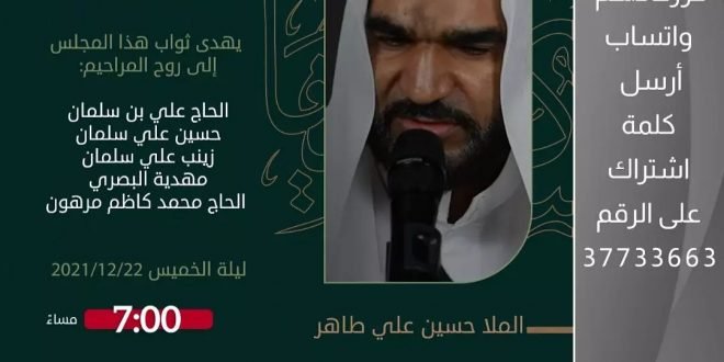 ‘ ۩ مأتم كرزكان .. *« القراءة الأسبوعية »* *الخطيب* : الملا حسين علي طاهر *الـوقـــت* : 7:00 مساء *اللــــيلـة* : ليلة الخميس *المـوافق* : 22/12/2021 يھدى ثواب هذا المجلس إلى روح المراحيم: ▪️الحاج علي بن سلمان ▪️حسين علي سلمان ▪️زينب علي سلمان ▪️مھدية البصري ▪️الحاج محمد كاظم مرهون الفاتحة …
