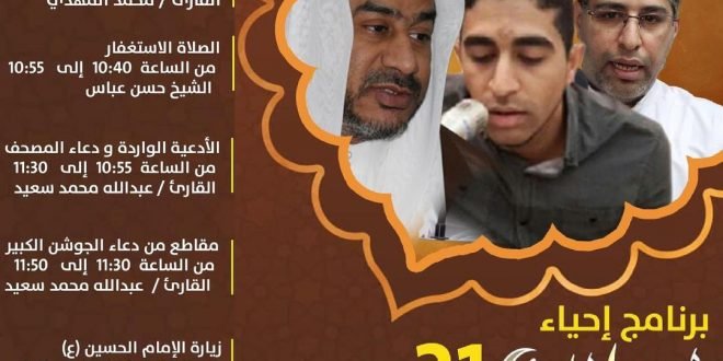 . ۩ جۚامۘـ؏ كرزكان .. 🌒 ﻣأﭠم ﻛرزﻛٱن .. ✾ برنامـج إحياء ليلة القدر الشريفة(٢١) لبعض المقلدين 🕌_القرآن الكريم_ 🎙️ *القارئ محمد المهدي* ⌚ من الساعة ١٠:٣٠ إلى ١٠:٤٠ 🕌 الصلاة والاستغفار 🎙️ *الشيخ حسن عباس* ⌚ من الساعة ١٠:٤٠ إلى١٠:٥٥ 🕌 الأدعية الواردة ودعاء المصحف 🎙️ *القارئ عبدالله محمد …