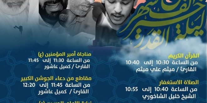 ۩ جۚامۘـ؏ كرزكان .. 🌒 ﻣأﭠم ﻛرزﻛٱن .. ✾ برنامـج إحياء ليلة القدر الشريفة(٢١) 🕌_القرآن الكريم_ 🎙️ *القارئ ميثم علي ميثم* ⌚ من الساعة ١٠:٣٠ إلى ١٠:٤٠ 🕌 الصلاة والاستغفار 🎙️ *الشيخ خليل الشاخوري* ⌚ من الساعة ١٠:٤٠ إلى١٠:٥٥ 🕌 الأدعية الواردة ودعاء المصحف 🎙️ *القارئ خليل عبدالرسول* ⌚ ١٠:٥٥ …