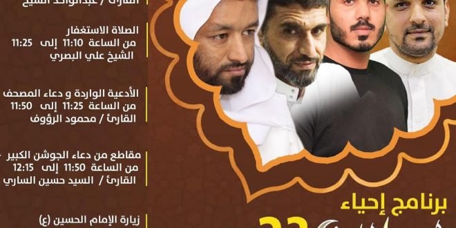۩ جۚامۘـ؏ كرزكان .. 🌒 ﻣأﭠم ﻛرزﻛٱن .. ✾ برنامـج إحياء ليلة القدر الشريفة(٢٣) لبعض المقلدين 🕌_القرآن الكريم_ 🎙️ *القارئ عبدالواحد الشيخ* ⌚ من الساعة ١١:٠٠ إلى ١١:١٠ 🕌 الصلاة والاستغفار 🎙️ *الشيخ علي البصري* ⌚ من الساعة ١١:١٠ إلى١١:٢٥ 🕌 الأدعية الواردة ودعاء المصحف 🎙️ *القارئ محمود الفردان* ⌚ …