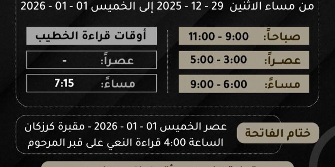…•|【 دعاء كميل&دعاء الندبة 】|•… 📖 *دعاء كميل* 🗓 *01/01/2026* ⏱ بعد الصلاة مباشرة 🗣 القارئ خليل ياسين 📺 *الـبـث المباشر على قناة* *مـأتـم كـرزكـان للرجـال* http://www.youtube.com/MatamKarzakan/live 📖 *دعاء الندبة* 🗓 *02/01/2026* ⏱ بعد الصلاة مباشرة 🗣 القارئ أ. عباس المهدي 🧕يوجد مكان للنساء ╼ ╾╼ ╾╼ ╾╼ ╾╼ ╾ …