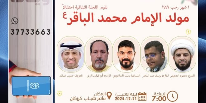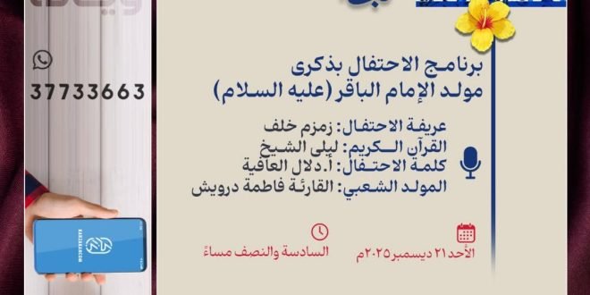 ≣▕ نـبـــــــــارک لـكـــم ذكـــــرىٰ ≣≣ ولادة الإمام محمد الباقر ‘ع’ ᪥ تقيم اللجنة الثقافية إحتفالًا بمناسبة مولد الإمام محمد الباقر ‘ع’ ❉ العــريف: حـسـين الخـاتـم ❉ القــــرآن: القارئ يوسف عبد الناصر ❉ الكلمــــة: الشيخ محمود العجيمي ❉ مســابقة: بـاسـم الشاخـوري ❉ الجلوات: الرادود أبو فراس البرني ⌕ ليلة الإثنين 21-2025-12م …