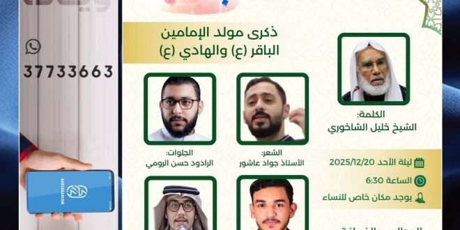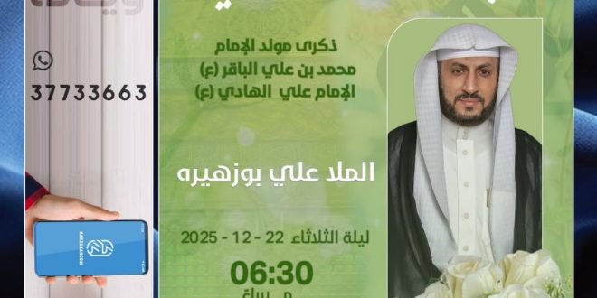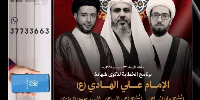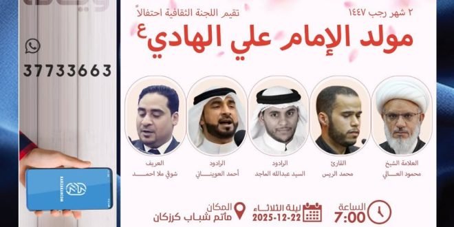❞ ذكــــرىٰ استشھاد الإمــام ،، ❞ علي بن محمد الھادي ’ع‘ ،، ▓ ليلة الأربعاء 23-12-2025 ▓ موكب أبناء الطف (للأشبال) █ الرادود الحسيني علي سلطان ≣ الإنطلاق من أمام مأتم كرزكان للرجال ⌯ 07:15 مساءً ▓ الخطابة الحسينية █ الشيخ علي الساعي ≣ مأتم كرزكان للرجال ⌯ 08:00 مساءً …