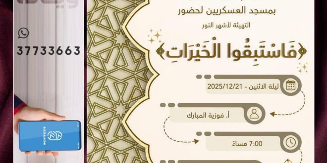 ✨ نتهيأ فيها لشهر تفتح فيه أبوابه الجنان و تغلق أبواب النيران ✨ ✨ونبتهل فيه بولادة النورين✨ ✨هدايا وجوائز للحضور✨ *لمتابعة فعالياتنا الأشتراك*👇….. https://chat.whatsapp.com/He22H7R4Qp8HCKH2E2pxtG 📸*حسابنا على الإنستغرام* @askreen.k *للاستفسار والتواصل*… 33790744 🌹تفضلوا علينا بالنشر ولكم جزيل الشكر 💕 المصدر: إنستغرام