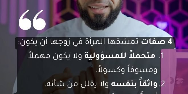 4 صفات تعشقها المرأة في زوجها أن يكون: متحملاً للمسؤولية ولا يكون مهملاً ومسوفاً وكسولاً. واثقاً بنفسه ولا يقلل من شأنه. أنيقاً ومهتماً بملابسه ومظهره الخارجي. سنداً لها في كل أحوالها. سماحة الشيخ جعفر عاشور . @jafferashoor . المصدر: إنستغرام