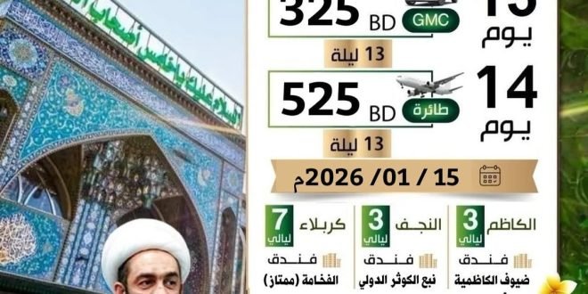 15 يوم جمسي 325 دينار 14 يوم طائرة 525 دينار السفر 15 / 1 / 2026م . ○ كربلاء فندق الفخامة (قريب ومميز) ○ الكاظمية فندق ضيوف قصر الكاظمية ○ سامراء..زيارة فقط ○ النجف فندق نبع الكوثر الدولي (راقي وقريب) . الرحلة تشمل جميع الخدمات (عدا الفيزا ووجبات الطريق) . …