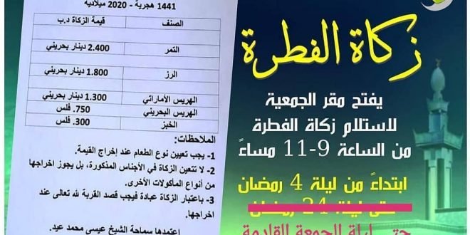 . مقر جمعية كرزكان الخيرية مفتوح لاستلام زكاة الفطرة حتى ليلة الجمعة القادمة كآخر موعد من الساعة 9:00 إلى 11:00 م، حيث ونظرا للظروف الراهنة لن يكون من الممكن استلام الزكاة ليلة العيد ويومه #جمعية_كرزكان_الخيرية #كرزكان #كرزكانكم #أخبار_كرزكانكم #منوعات_كرزكانكم #قريتنا #أخبار_القرية #قريتنا_الحبيبة #قرية_كرزكان #أخبار_قرية_كرزكان #قرى_البحرين #مملكة_البحرين #البحرين #بحريننا #bahrain #karzakan …