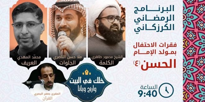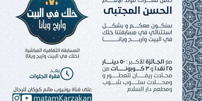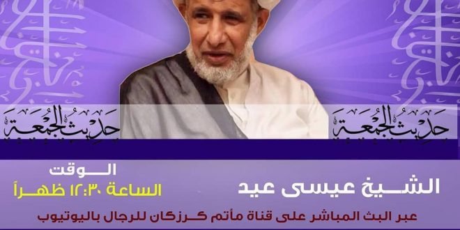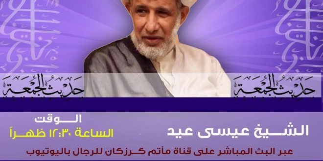 *البرنامج الرمضاني الكرزكاني * . . . •< *حديث الجمعة* >• . . . الجمعة 08/05/2020 . . الوقت : 12:30 . . سماحة الشيخ عيسى عيد . . . وذلك عبر البث المباشر على وصلة قناة مأتم كرزكان للرجال باليوتيوب . . ⚠️ وصلة البث المباشر . http://www.YouTube.com/MatamKarzakan . …