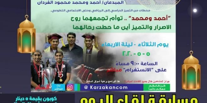 مسابقة لقاء اليوم .. اكتب إجابتك في التعليقات وادعوا الآخرين للمشاركة… منشن شخص تتحداه يعرف الجواب.. ترقبوا السحب خلال لقاء اليوم في تمام الساعة التاسعة مساءً .. ملاحظة: يجب أن تكون من متابعي حساب كرزكانكم وان تكون إجابتك غير متكرره في صفحة السحب وان لا تكون قد فزت من …