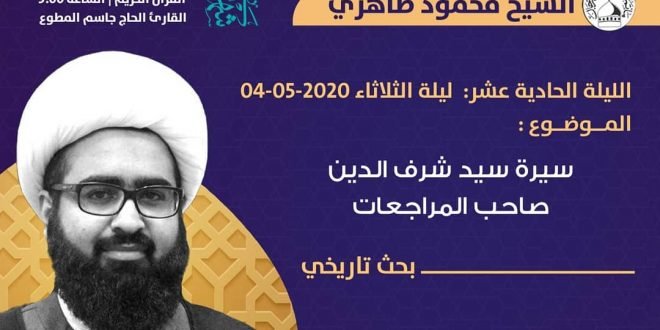 ‘ ۩ ﻣأﭠم ﻛرزﻛٱن .. . . البرنامج الرمضاني الكرزكاني . 🌙 برنامج مأتم كرزكان للرجال للشهر الفضيل عبر البث المباشر . الليلة الحادية عشر : ليلة الثلاثاء 04/05/2020 . الشيخ محمود طاهري . عنوان المحاضرة : *سيرة سيد شرف الدين صاحب المراجعات “* بحث تاريخي . دعاء الإفتتاح | …