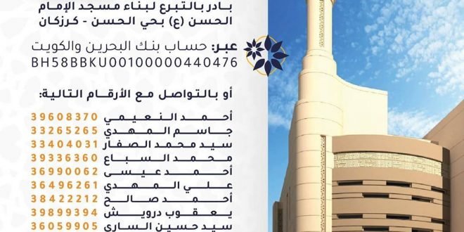 🕌 *حملة بناء مسجد الإمام الحسن عليه السلام / حي الحسن – قرية كرزكان* 🕌 . ☘️ *ثبت لك الآن قدم صدق عند مليك مقتدر* ☘️ . ♎️ *إِنَّمَا يَعْمُرُ مَسَاجِدَ اللَّهِ مَنْ آمَنَ بِاللَّهِ وَالْيَوْمِ الْآخِرِ وَأَقَامَ الصَّلَاةَ وَآتَى الزَّكَاةَ وَلَمْ يَخْشَ إِلَّا اللَّهَ فَعَسَىٰ أُولَٰئِكَ أَن يَكُونُوا مِنَ …