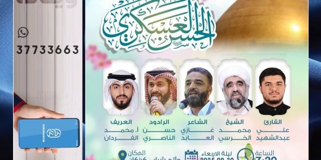 ≣▕ نـبـــــــــارک لـكـــم ذكـــــــــــرىٰ ≣≣ ولادة الإمام الحسن العسكري ‘ع’ ᪥ برنامج الاحتفال بمناسبة مولد الإمام الحسن العسكري ‘ع’ ❉ العــريف: الأستاذ محمد الفردان ❉ القــــرآن: القارئ علي عبدالشھيد ❉ الكلمــــة: الشيخ محمد الخرسي ❉ الشـــعـر: الشاعر غازي العابد ❉ الجلوات: الرادود حسن الناصري ⌕ ليلة الأربعاء 30-2025-9 ⌕ الساعة: …