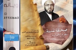 📜 بعنوان: “صحيفة المدينة” 🎙 المحاضر: سماحة الشيخ ابراهيم زين الدين 📆 السبت (ليلة الأحد) …