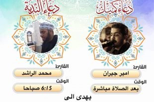 أكمل القراءة »اعلان دعاء كميل ودعاء الندبة لهذا الاسبوع دعاء كميل القارئ امير جيران دعاء الند…