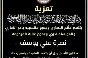 ▪انتقلت إلى رحمة الله تعالى ورضوانه الحاجة نصرة علي يوسف، زوجة الحاج أحمد البصري ووالدة …