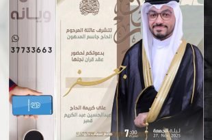 أكمل القراءة » 🌺تتشرف عائلة المرحوم الحاج جاسم المدهون بدعوتكم لحفل عقد قران نجله *«جعفر»*، بمأتم شباب كرزكان.