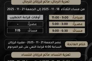 اليوم الثلاثاء 18-11-2025. التشييع عصر اليوم الساعة 3:30. تجهيز القبر الآن . تغمد الله الفقيد …