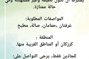 يُشترط أن تكون نظيفة وغير مستهلكة وفي حالة ممتازة. المواصفات المطلوبة: غرفتان حمّامان صالة مطبخ …