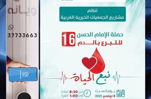أكمل القراءة »دعوة للأهالي للحضور والتبرع بالدم في حملة الإمام الحسن (ع) 16 للتبرع بالدم والتي تقيمها لجنة مشاريع الجمعيات الخيرية بالمنطقة الغربية على صالة مركز تمكين شباب كرزكان يوم السبت القادم من الساعة 8:30 صب