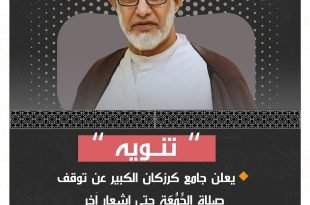 ۩ جۚامۘـ؏ ڪڕزڪٰٱ̍ن 🔸يعلن جامع كرزكان الكبير عن توقف صلاة *الجُمُعَة* حتى اشعار آخر الموافق: …