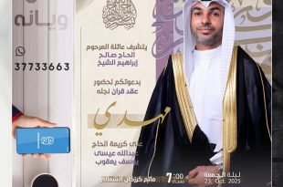 أكمل القراءة » 🌺تتشرف عائلة المرحوم الحاج صالح إبراهيم الشيخ بدعوتكم لحفل عقد قران نجله *«مهدي»*، بمأتم شباب كرزكان.