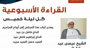 برنامج القرآءة الأسبوعية بمأتم شباب كرزكان الموافق: 24/7/2019 يهدى ثواب هذا المجلس إلى أرواح المراحيم: الحاج فاضل بن عيد الحاج إبراهيم فاضل عيد السيد حسن السيد مجيد . الفاتحه المصدر