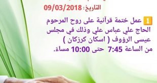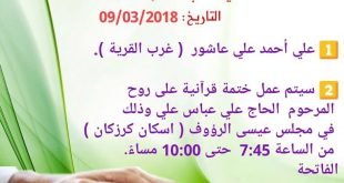 . تدعوكم اللجنة الإجتماعية في جمعية كرزكان الخيرية لعمل ختمة ليلة السبت 9-3-2018…