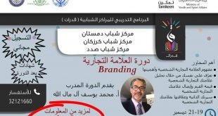 ضمن البرنامج التدريبي للمراكز الشبابية #قدرات. . بدعم من وزارة شؤون الشباب والرياضة وصندوق العمل تمكين تنظم مراكز كرزكان، دمستان وصدد الشبابية دورة “العلامة التجارية Branding” من الفترة 19 ديسمبر الى 21 ديسمبر2017 من الساعة 5:30الى 8:30. 📌📌دورة العلامة التجارية Branding📌📌 العلامة التجارية الشخصية هي انعكاس لهويتك حيث تسلّط الضوء …