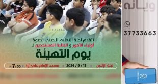 لجنة التعليم الديني – كرزكان تتقدم لجنة التعليم الديني لدعوة أولياء الأمور والطلبة ليوم تهيئة الطلبة المستجدين لصف أول إعدادي مسجد الإمام علي (ع) 7:15 م ليلة الإثنين 15-9-2024 @taleemdk المصدر: إنستغرام