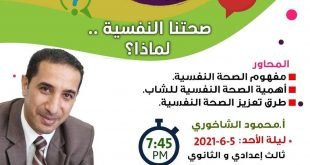 الفصـ(3)ـل البرنامج الصيفي “وميض” *° -ورش- °* *ليلة الأحد* لطلبة الثالث الإعدادي والثانوي. *صحتنا النفسية … لماذا؟* مع الأستاذ محمود الشاخوري @taleemdk المصدر