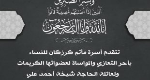 ‘ بسم ٱلله الرَّحْمٰنِ الرَّحِيـمِ {كُلُّ نَفْسٍ ذَآئِقَةُ الْمَوْتِ وَإِنَّمَا تُوَفَّوْنَ أُجُورَكُمْ يَوْمَ الْقِيَامَةِ فَمَن زُحْزِحَ عَنِ النَّارِ وَأُدْخِلَ الْجَنَّةَ فَقَدْ فَازَ وَما الْحَيَاةُ الدُّنْيَا إِلاَّ مَتَاعُ الْغُرُورِ } صدق الله العلي العظيم يتقدم مأتم كرزكان للرجال بخالص العزاء والمواساة لعائلة المرحومة “الحاجة شيخة أحمد علي ” سائلين المولى العلي القدير أن يتغمد …