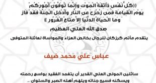– . . بسم ٱلله الرَّحْمٰنِ الرَّحِيـمِ {كُلُّ نَفْسٍ ذَآئِقَةُ الْمَوْتِ وَإِنَّمَا تُوَفَّوْنَ أُجُورَكُمْ يَوْمَ الْقِيَامَةِ فَمَن زُحْزِحَ عَنِ النَّارِ وَأُدْخِلَ الْجَنَّةَ فَقَدْ فَازَ وَما الْحَيَاةُ الدُّنْيَا إِلاَّ مَتَاعُ الْغُرُورِ } صدق الله العلي العظيم . . تتقدم إدارة مأتم كرزكان للرجال بخالص العزاء والمواساة لعائلة المرحوم . . “عباس علي محمد ضيف” …