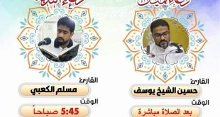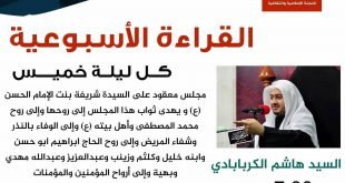 – . . ۩ مأتم كرزكان .. . . « القرآءة الأسبوعية» . . *الخطيب* : السيدهاشم الكربابادي *الوقـــت* : 7:00 م . *المكـــان* : مأتم شباب كرزكان *اللــــيلة* : ليلة الخميس *الموافق* : 20/11/2019 . . مجلس معقود على السيدة شريفة بنت الإمام الحسن (ع) ويهدى ثواب هذا المجلس …