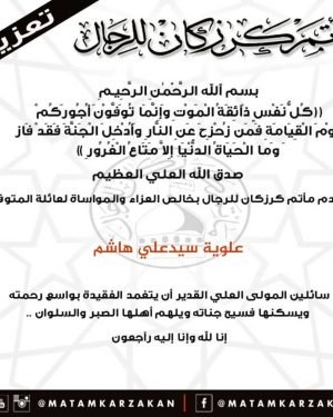 – . . بسم ٱلله الرَّحْمٰنِ الرَّحِيـمِ {كُلُّ نَفْسٍ ذَآئِقَةُ الْمَوْتِ وَإِنَّمَا تُوَفَّوْنَ أُجُورَكُمْ يَوْمَ الْقِيَامَةِ فَمَن زُحْزِحَ عَنِ النَّارِ وَأُدْخِلَ الْجَنَّةَ فَقَدْ فَازَ وَما الْحَيَاةُ الدُّنْيَا إِلاَّ مَتَاعُ الْغُرُورِ } صدق الله العلي العظيم . . تتقدم إدارة مأتم كرزكان للرجال بخالص العزاء والمواساة لعائلة المرحومة . . “علوية سيدعلي هاشم” . …