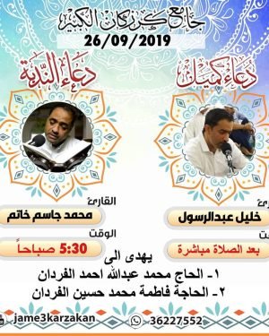 أكمل القراءة »اعلان دعاء كميل ودعاء الندبة لهذا الاسبوع دعاء كميل القارئ خليل عبدالرسول دعاء…