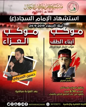 ‘ . ۩ ﻣأﭠم ﻛرزﻛٱن .. . . 🏴 بَرنامجْ مَأتم كَرزكّان للرجال للمَجالِسْ الحُسَيـنِيْة بذكرى إستشهاد الإمام السجاد (ع) محرم الحرام ١٤٤١ هـ | ٢٠١٩ م . . • ليلاً ( 7:45 م ) “الشيخ علي الساعي” . . • صباحاً ( 10:00 ص ) “الملا محمد المخلوق” . …