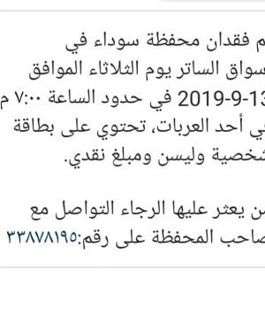 أكمل القراءة ». تم فقدان محفظة سوداء في أسواق الساتر يوم الثلاثاء الموافق 10-9-2019 في حدود ا…