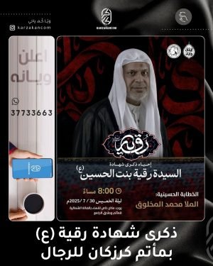 ❞ ذكـرىٰ اسـتشـھـاد ،، ❞ السيدة رقية ’ع‘ ،، ▓ ليلة الخميس 30-7-2025 ▓ موكب أبناء الطف (للأشبال) █ الرادود الحسيني مرتضى البصري ≣ الإنطلاق من أمام مأتم كرزكان للرجال ⌯ 07:30 مساءً ▓ الخطابة الحسينية █ الملا محمد المخلوق ≣ مأتم كرزكان للرجال ⌯ 08:00 مساءً ▓ موكب العزاء …