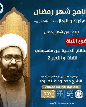 – . . ۩ ﻣأﭠم كرژﮑاﻥ.. . . 🌙 برنامج شهر رمضان المبارك ١٤٤٠ هـ . . 🔸️ليلة 1 من شهر رمضان . . مع سماحة *الشيخ محمود طاهري* . . • موضوع الليلة : *《الحقائق الدينية بين مفهومي الثبات والتغير 2》 . . #Bahrain #Matam #Karzakan #البحرين #مأتم_كرزكان #مأتم_السنابس …