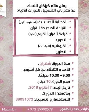 #karzkkan #karzkan #كرزكان #دورات_مأتمكن #دورات #كروشيه #تطريز #تجويد #قراءة_صحيحة #القرآن_الكريم #تدريب #تطوير #منتظرات_حتى_الظهور #المنطقة_الغربية #دمستان #المالكية #صدد #شهركان #خطابة_حسينية المصدر