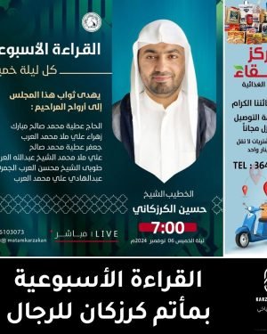 *الخطيب* : الشيخ حسين الشيخ مهدي الكرزكاني *الوقــــت* : 7:00 مساء *اللـــيـلـة* : ليلة الخميس *المـوافق : 06/11/2024 ▪️مجلس معقود على الإمام موسى الكاظم ع ويهدى ثواب هذا المجلس إلى أرواح المراحيم : ▪️الحاج عطية محمد صالح مبارك ▪️زهراء علي ملا محمد العرب ▪️جعفر عطية محمد صالح ▪️علي ملا محمد …