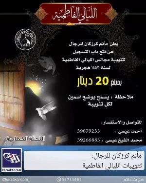 أكمل القراءة »‘ ۩ مأتم كرزكان .. «الليالي الفاطمية» يعلن مأتم كرزكان للرجال عن فتح باب الت…