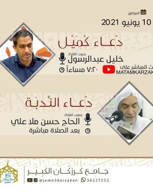 …•|【 دعاء كميل&دعاء الندبة 】|•… 📖 *دعاء كميل* 🗓 *٢٠٢١/٦/١٧* ⏱٠٧:٢٠ مساءاً 🗣 القارئ خليل عبدالرسول 📺 *الـبـث المباشر على قناة* *مـأتـم كـرزكـان للرجـال* http://www.youtube.com/MatamKarzakan/live 📖 *دعاء الندبة* 🗓 *٢٠٢١/٦/١٨* ⏱ بعد الصلاة مباشرة 🗣 القارئ الحاج حسن ملا علي المصدر