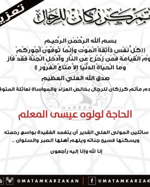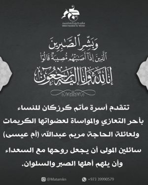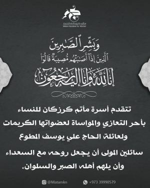 ‘ بسم ٱلله الرَّحْمٰنِ الرَّحِيـمِ {كُلُّ نَفْسٍ ذَآئِقَةُ الْمَوْتِ وَإِنَّمَا تُوَفَّوْنَ أُجُورَكُمْ يَوْمَ الْقِيَامَةِ فَمَن زُحْزِحَ عَنِ النَّارِ وَأُدْخِلَ الْجَنَّةَ فَقَدْ فَازَ وَما الْحَيَاةُ الدُّنْيَا إِلاَّ مَتَاعُ الْغُرُورِ } صدق الله العلي العظيم يتقدم مأتم كرزكان للرجال بخالص العزاء والمواساة لعائلة المرحومة “الحاجة لولوه عيسى المطوع ” سائلين المولى العلي القدير أن يتغمد …