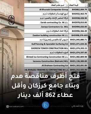 وأظهرت البيانات أن أقل العطاءات كان مقدَّمًا من مجموعة الخنيزي بقيمة 862 ألف دينار. ، بينما سجَّلت شركة مقاولات دار الخليج أعلى عطاء بقيمة 1,312,425 دينار. وذلك من بين 15 عطاء. فيما تتراوح باقي العطاءات بين 932 ألف و1.136 مليون دينار بحريني. وتعد المناقصة تابعة للمجلس الأعلى للشؤون الإسلامية. . …