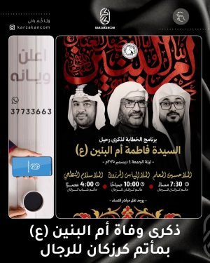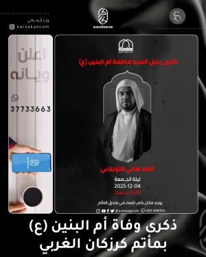 ❞ ذكـــرىٰ رحــــــــــيـل ،، ❞ السيّدة أم البنين ’ع‘ ،، ▓ ليلة الجمعة 4-12-2025 ▓ موكب أبناء الطف (للأشبال) █ الرادود الحسيني علي عبدالله ≣ الإنطلاق من أمام مأتم كرزكان للرجال ⌯ 06:45 مساءً ▓ الخطابة الحسينية █ الملا حسين المعلم ≣ مأتم كرزكان للرجال ⌯ 07:30 مساءً ▓ موكب …