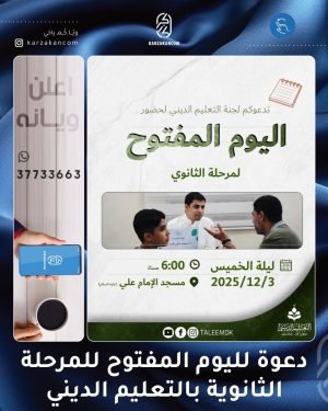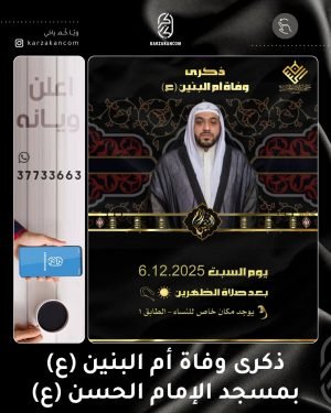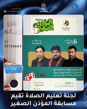 🚨 *إعْلَانٌ:* تَدْعُوكُمْ *لَجْنَةُ تَعْلِيمِ الصَّلَاةِ* لِحُضُورِ مُسَابَقَتِهَا السَّنَوِيَّةِ الْكُبْرَى فِي نُسْخَتِهَا الْعَاشِرَةِ وَبِحُلَّتِهَا الْجَدِيدَةِ: 🎙️ *”مُسَابَقَةُ الْمُؤَذِّنِ الصَّغِيرِ”* بمشاركة لجنة تحكيم احترافية تضم: – 🎙️ الرادود *عبدالشهيد الثور* – 🎙️ الرادود *فوزي الدرازي* – 📝 الشاعر والأستاذ *علي مرهون* (اختصاصي شؤون التحكيم والتقييم) – 📅 *الزَّمَانُ:* لَيْلَةُ الأَحَد 📆 …