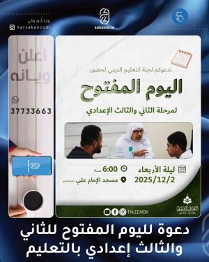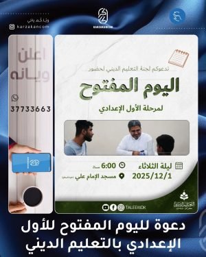 اليوم المفتوح لمرحلة أول إعدادي 1/12/2025 يرجى من الجميع احضار او حفظ الرقم الشخصي 📍مسجد الإمام علي(ع) 🕘 الساعة 6:00 مساءً ۩ التعليم الديني- كرزكان @taleemdk المصدر: إنستغرام